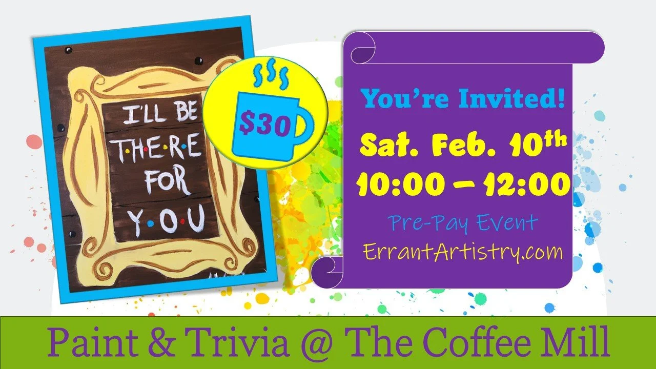 Paint + Trivia Class - Friends Themed Saturday, February 10, 2024 10:00 AM 12:00 PM The Coffee Mill 1730 South Carolina 86 Piedmont, SC, 29673 United States (map) Google Calendar ICS Get a ticket for the class